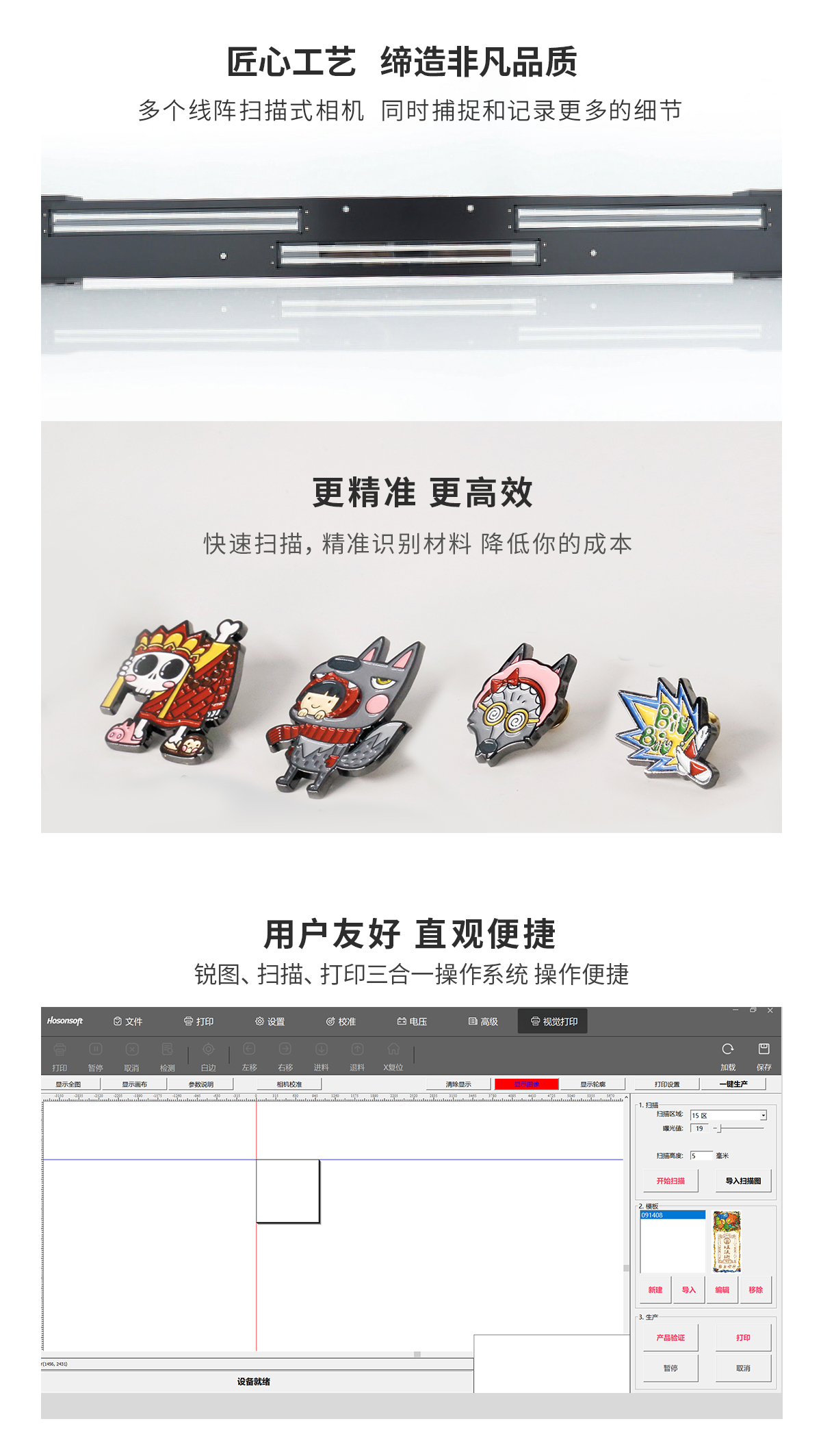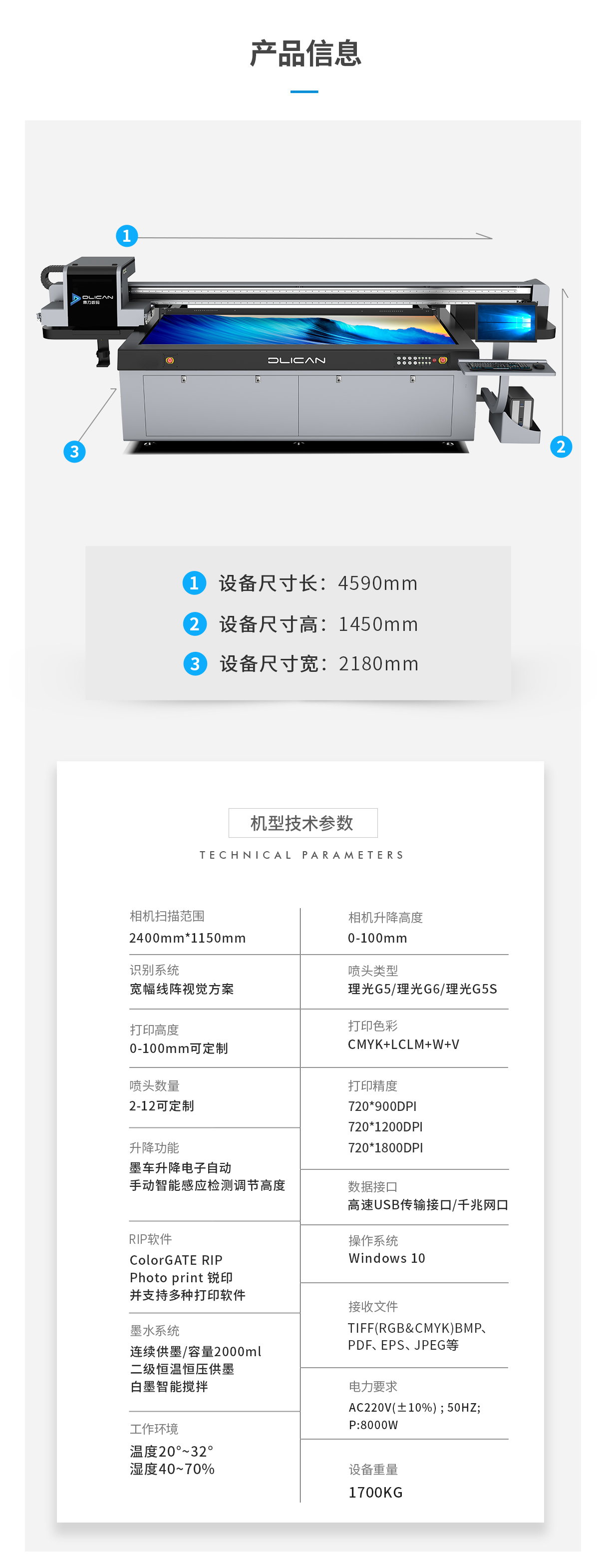 產品描述:最大打印尺寸2.5m*1.3m,UV打印機黃金尺寸,非接觸uv噴墨打印,即打即干,無需制版,靈活應對多種打印應用,長周期規模化打印穩定可靠。