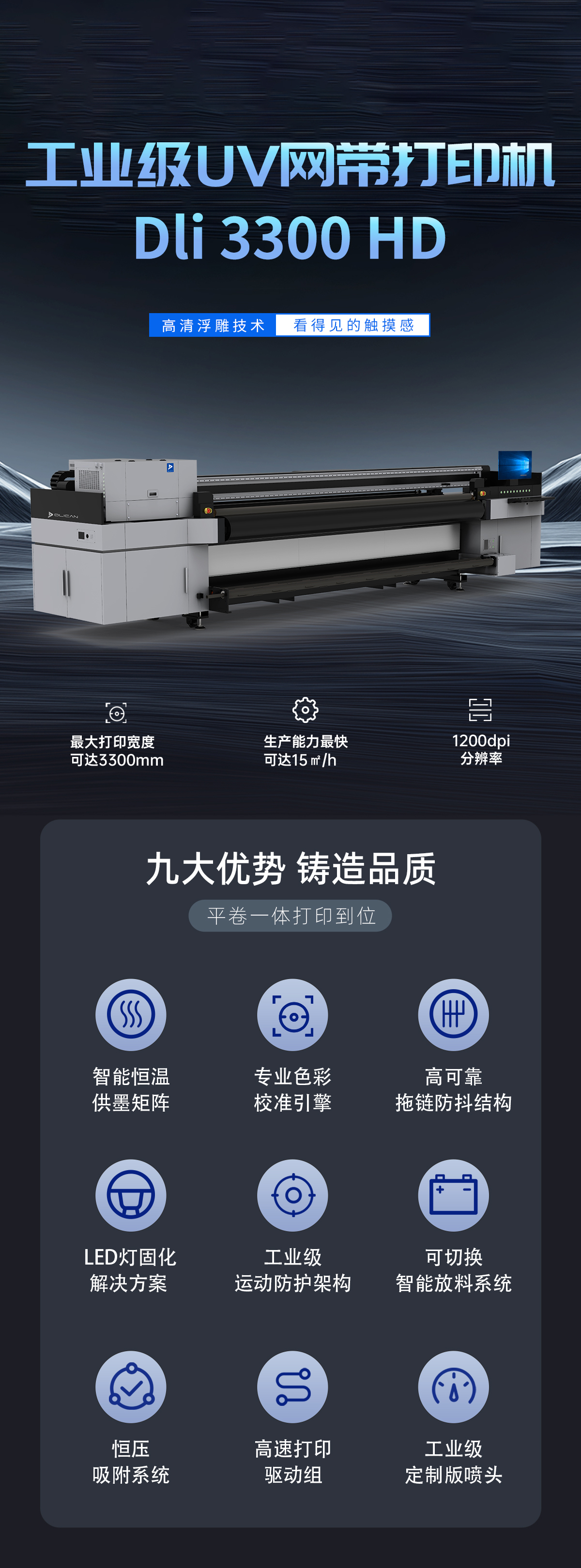 產品描述:工業級UV網帶打印機,打印幅面3.2米,板卷一體打印平臺,應用更廣泛